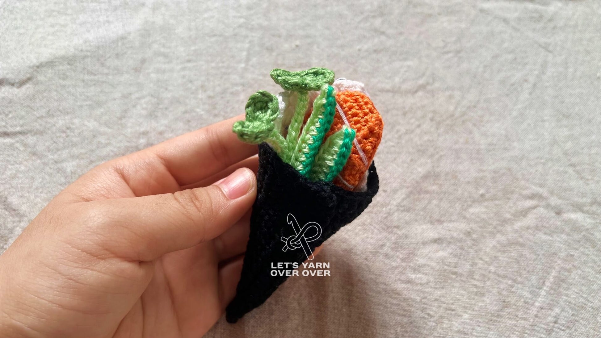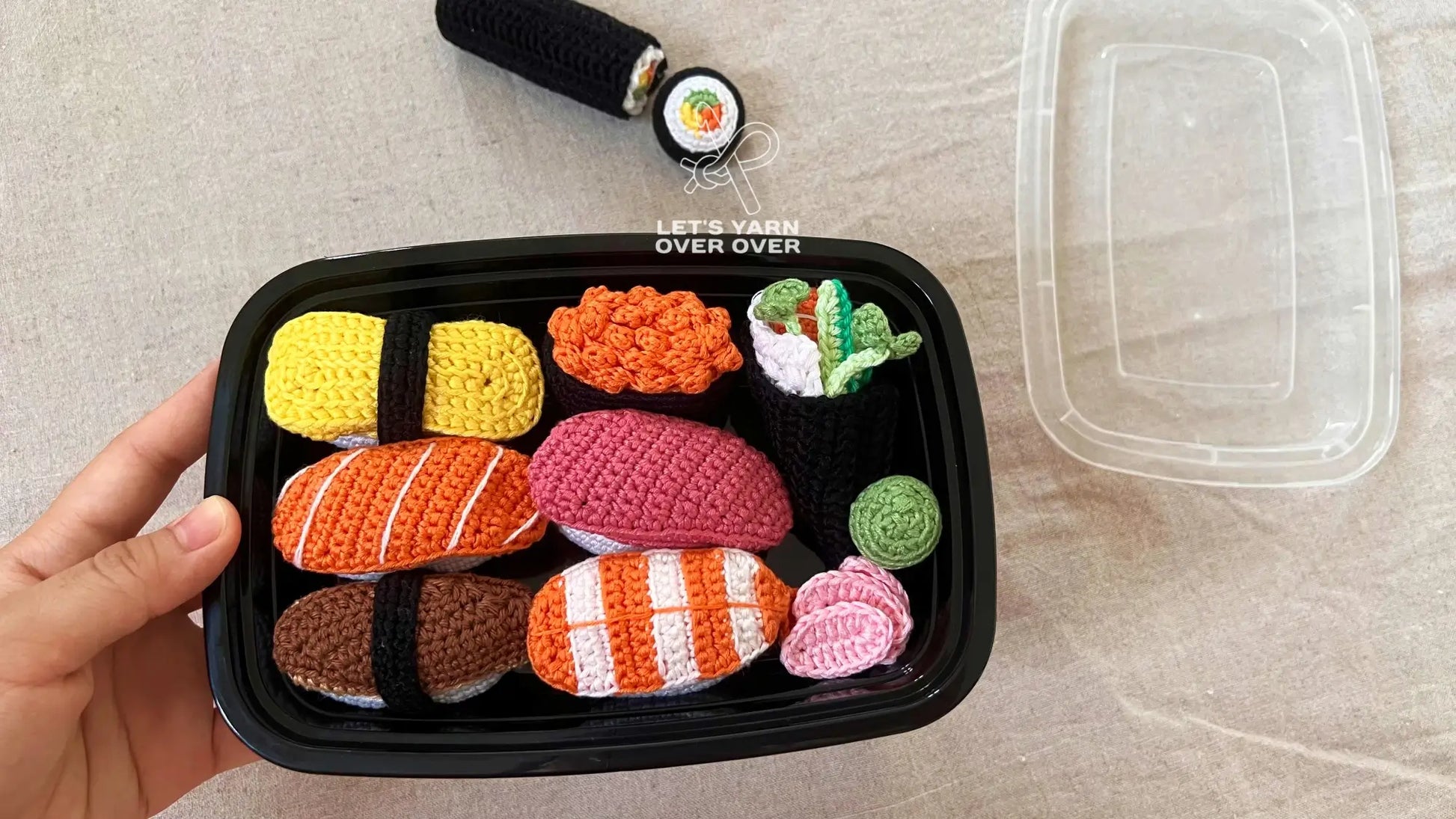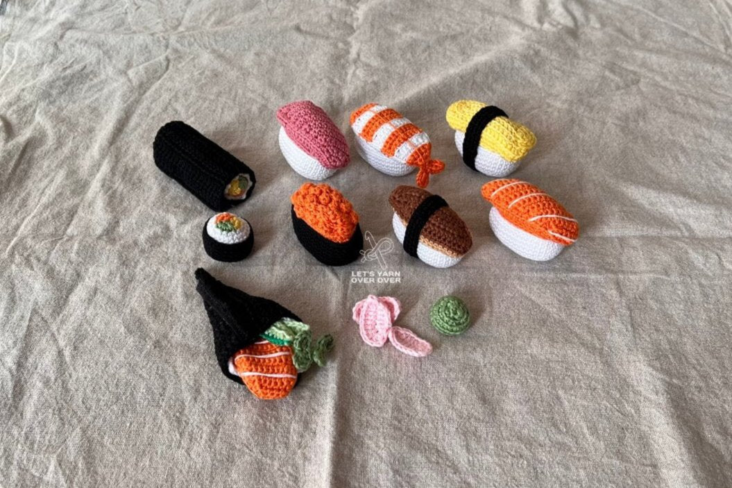 Let’s Crochet Your Sushi Playfood! This 20-page PDF file includes crochet patterns to make Nigiri (Shrimp, Salmon & Tuna, Eel), Tamago Sushi (Japanese Egg Omelet), Salmon Roe Gunkan, Sushi Roll making set, Temaki, etc. The crocheting process and the playing is incredible!